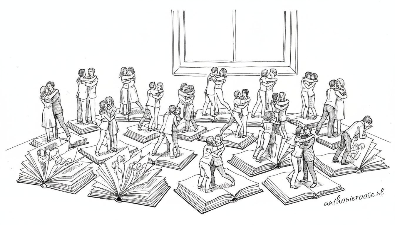 Tijd dus om iets ongebruikelijks te doen. Stel je voor dat je gaat zitten, gewoon op een stoel. Zonder podcast, zonder debat. Zonder documentaire over hoe alles anders in elkaar zit dan men denkt dat het zit. Je merkt je ademhaling op. Je voeten op de vloer. Je maag die zachtjes knorrend informeert hoe laat het eten klaar is. En je denkt: ‘Dit is toch eigenlijk ook opmerkelijk echt.’ Je begint te vermoeden dat verhalen misschien niet bedoeld zijn om er in te wonen of om jezelf erin te verschansen, maar om er naar te kíjken! Zoals toneelstukken: je kunt erdoor geraakt worden, je kunt erom lachen, maar het wordt problematisch wanneer je na afloop weigert de schouwburg te verlaten.