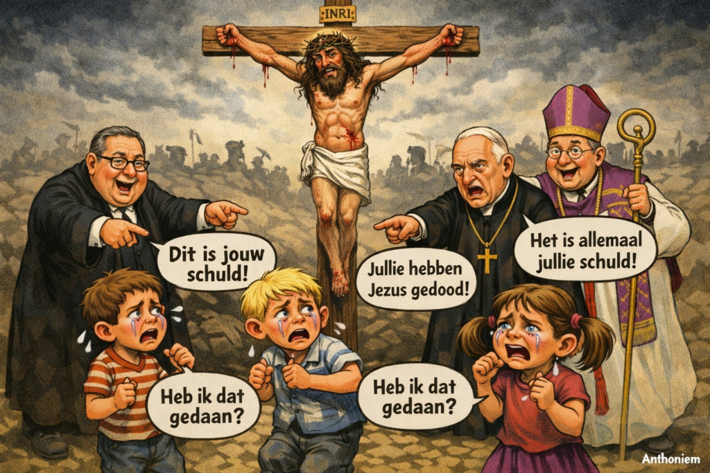 Stel je voor dat je een kind bent. Je zit aan tafel je boterham met hagelslag te eten. En iemand zegt: ‘Jezus is je beste vriend.’ Je wordt er warm van. Maar dan komt het tweede deel, vaak subtiel verpakt: ‘Hij moest sterven… door jou.’ Je verslikt je bijna in die hagelslag. Wacht even. Ik? Ben ik nu een moordenaar? Maar ik heb nog niet eens iets gedaan. Ik heb alleen gisteren een snoepje gepikt en mijn zus geplaagd.