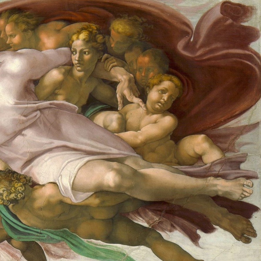 ‘De schepping van Adam’ is een van de beroemde fresco’s die Michelangelo Buonarroti in de jaren 1508-1512 heeft vervaardigd in de Sixtijnse Kapel in Vaticaanstad. Deze schildering heeft alles in zich waar het in de Apocalyps om gaat. De schepper en zijn schepsel worden weergegeven in één beeld. Links het schepsel, de naakte mens op aarde. En rechts de schepper, God met al zijn engelen in de hemel. De linkerarm van de mens en de rechterarm van God reiken naar elkaar. God heeft de mens als materieel wezen gemaakt naar het idee van zijn eigen geestelijke wezen. De vingers van God en mens raken elkaar net niet meer of nog net niet.